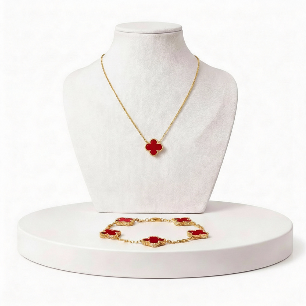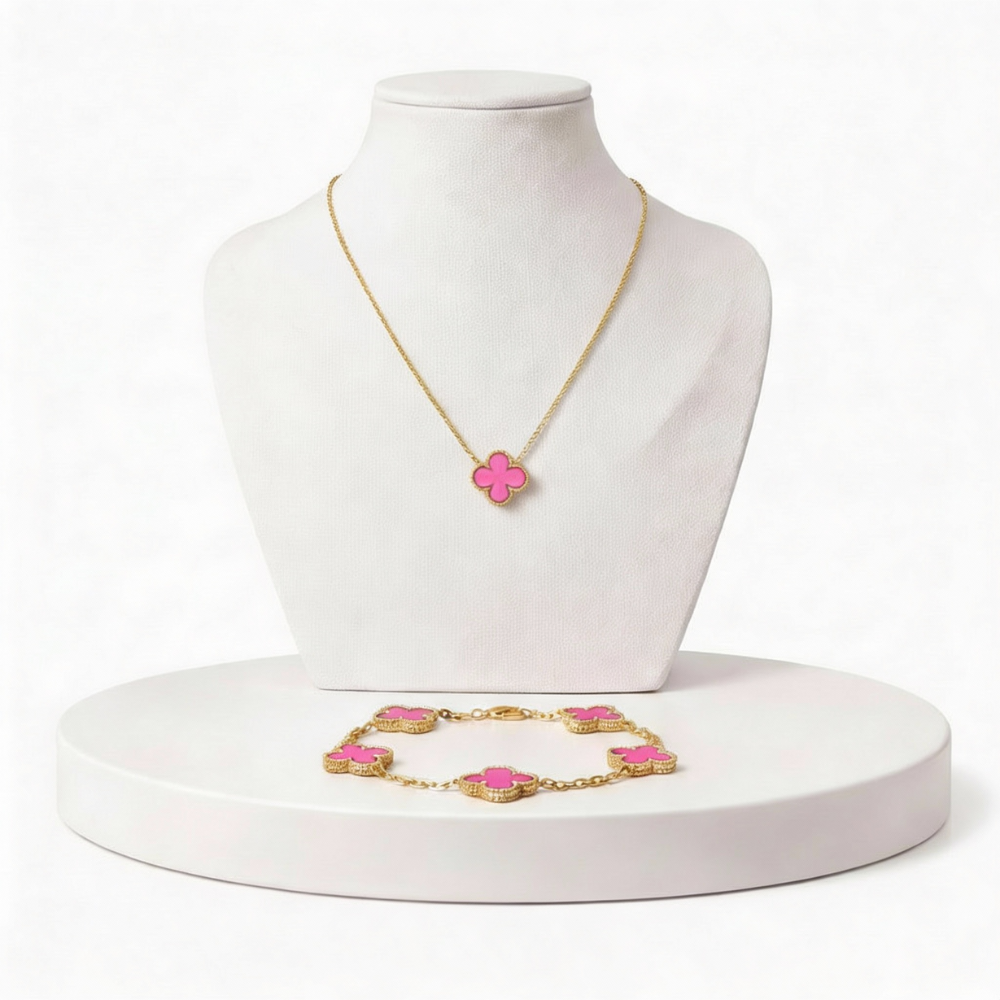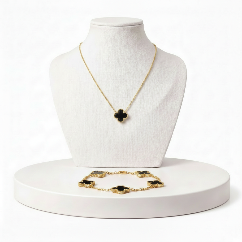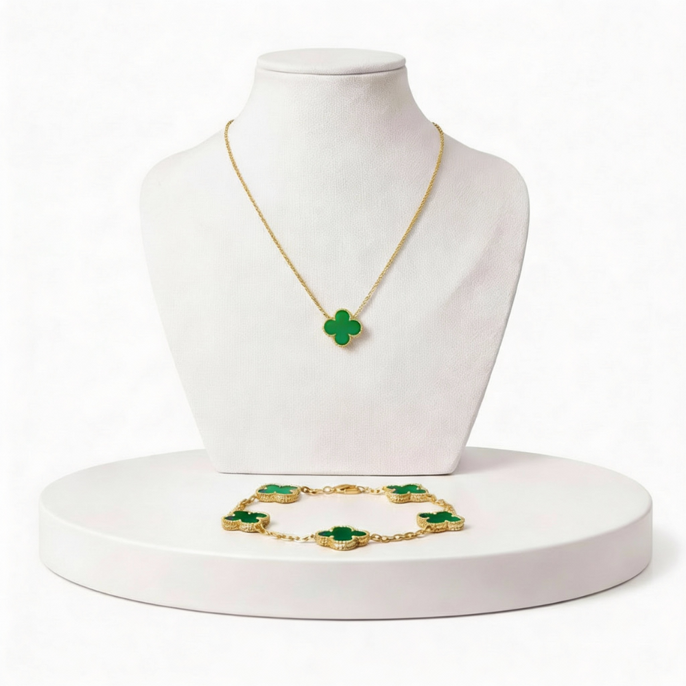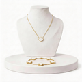 O conjunto inclui colar e pulseira combinando, com design delicado e atemporal, perfeito para quem busca sofisticação discreta e versatilidade.
