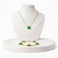 O Conjunto Trevo Áurea é confeccionado em aço nobre antialérgico com banho dourado 18K, oferecendo brilho intenso, acabamento sofisticado e excelente durabilidade.